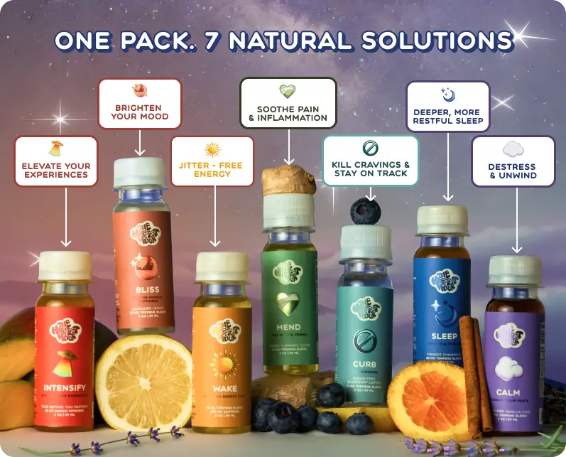Nope. Nada. Zero chance. Our shots contain no THC, no CBD, and no mind-altering anything. Just natural terpenes doing what they do best—helping your body shift into a better state, safely.